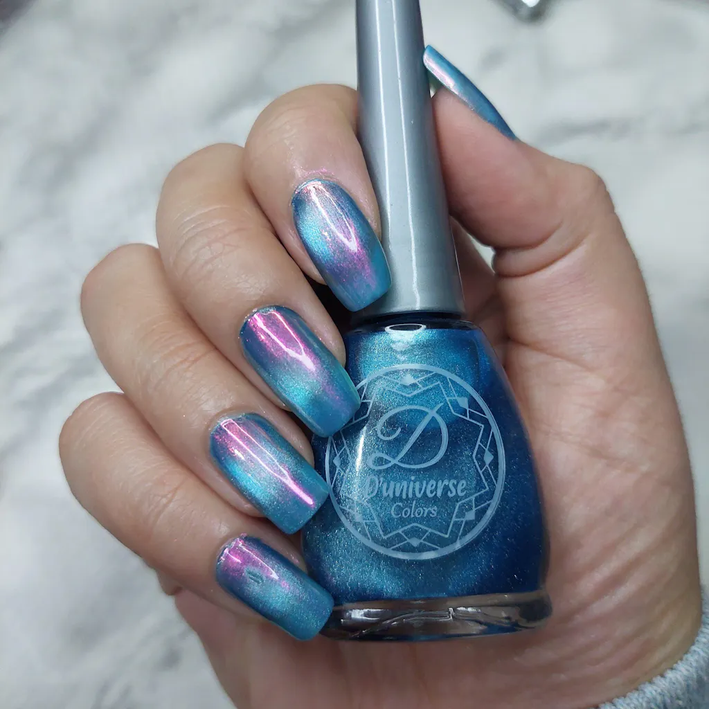 Medianoche → Un azul profundo y misterioso que envuelve como el cielo nocturno navideño. Su destello magnético se mueve con sutileza y poder. Esmalte tradicional ojo de gato azul con partícula velvet ultra brillante. NO requiere lámpara. Tiene base de color azul.