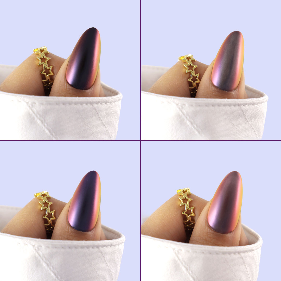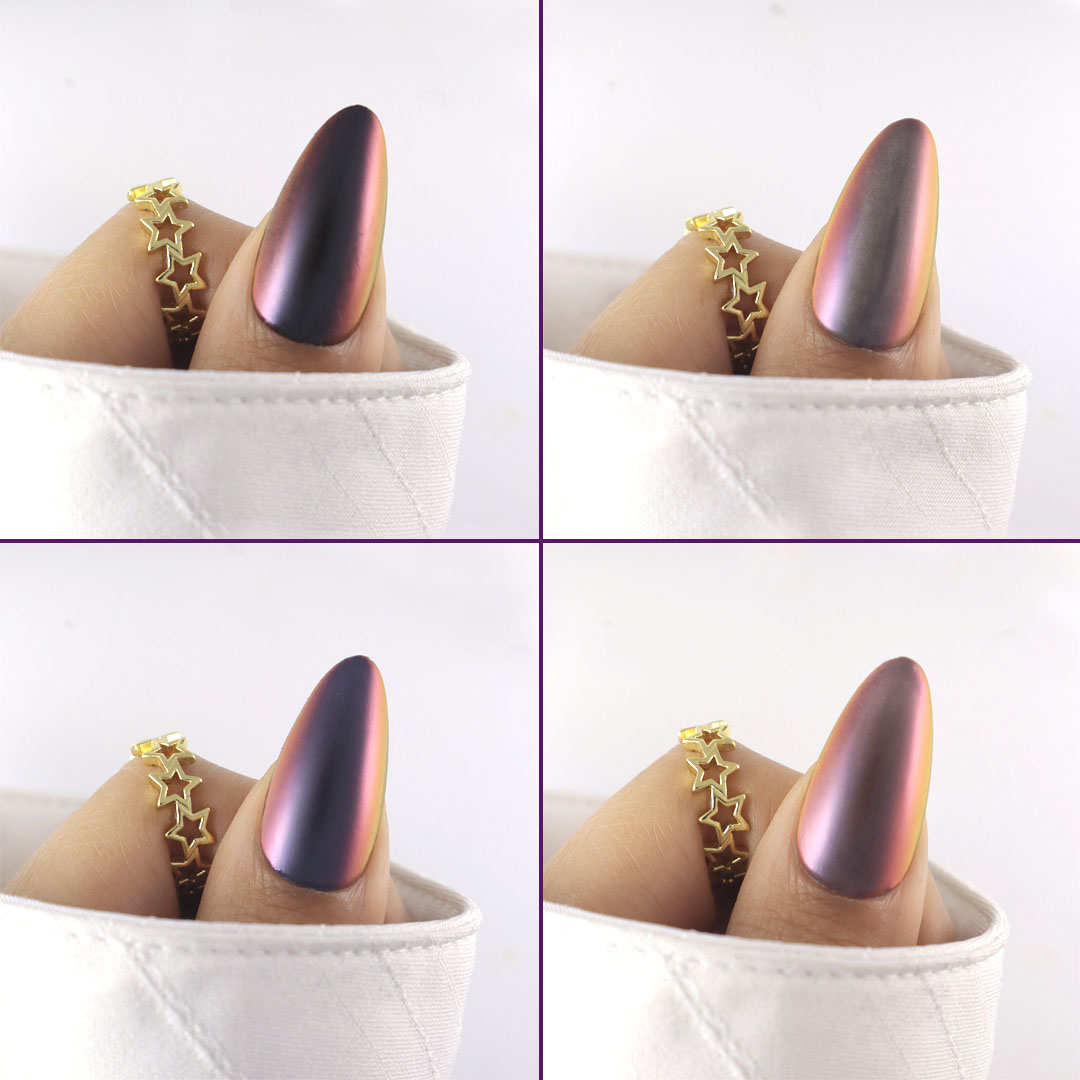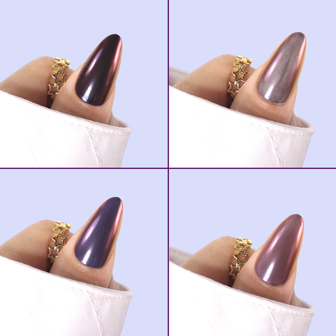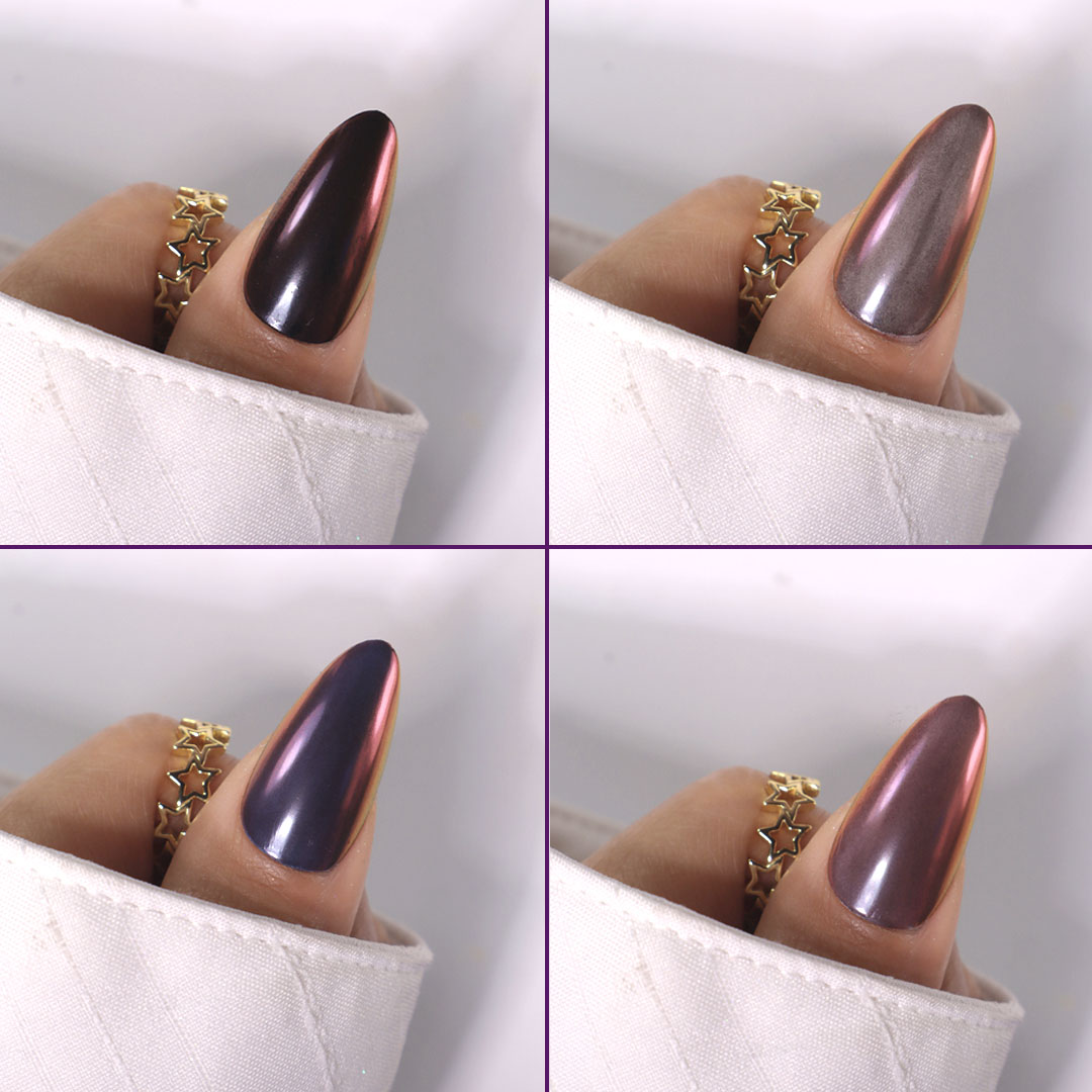 Aplícalo sobre tonos oscuros en tradicional o semipermanente, para conservar el efecto metalizado sella con un brillo base agua o con top coat semi.
