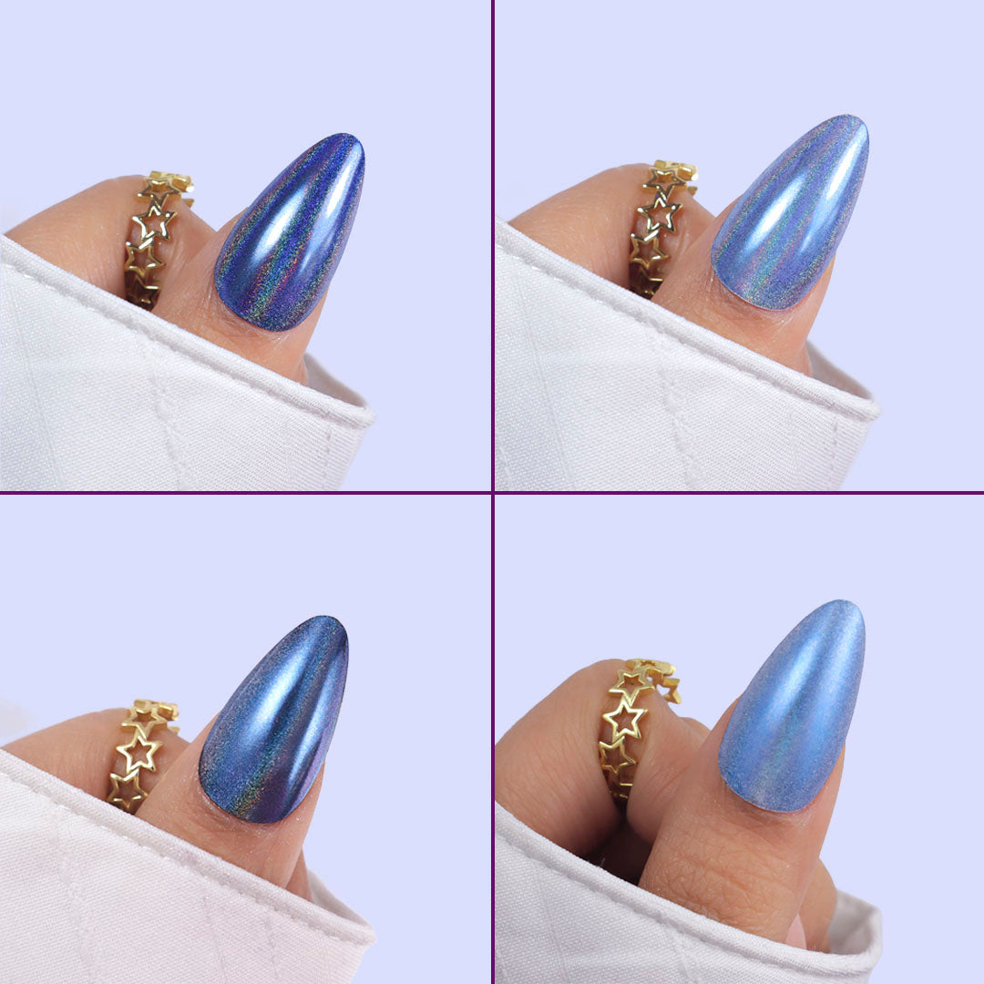 Aplícalo sobre tu tono de preferencia en tradicional o semipermanente, para conservar el efecto metalizado sella con un brillo base agua o con top coat semi.