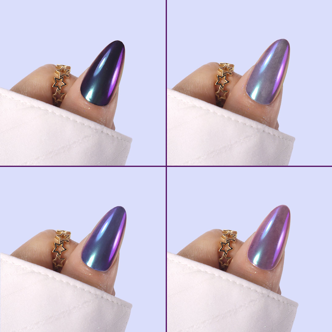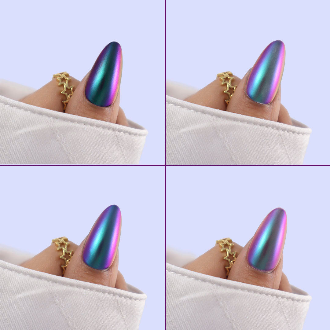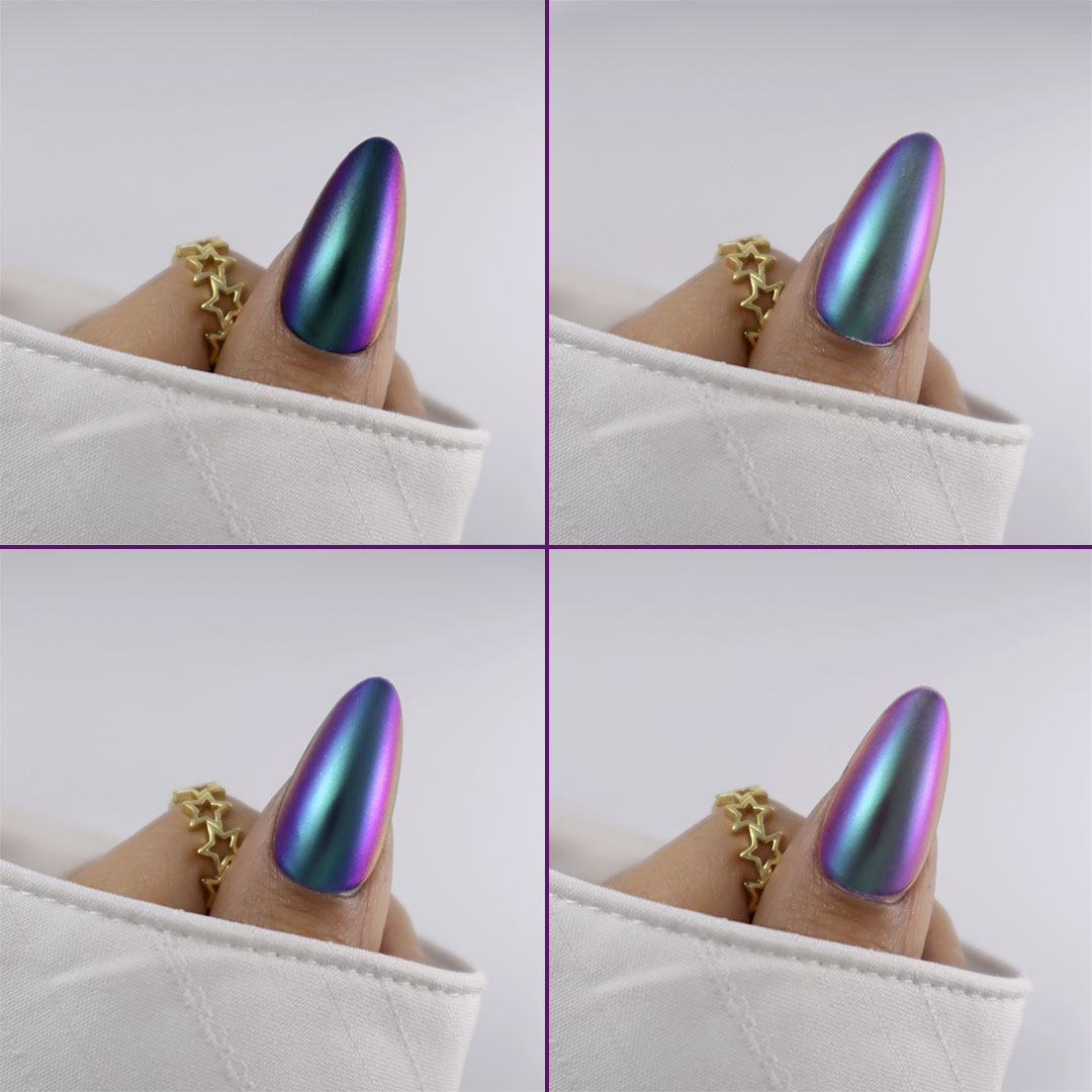Aplícalo sobre tonos oscuros en tradicional o semipermanente, para conservar el efecto metalizado sella con un brillo base agua o con top coat semi.